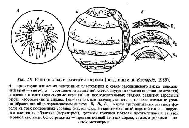 Желточный синцитий играет ведущую роль в эпиболии: его край активно сокращается (благодаря эндоцитозу участков клеточных поверхностей) и подтягивает в вегетативном направлении слой поверхностных клеток, которые при этом перегруппировываются. По завершении эпиболии образуется желточный мешок, который впоследствии втягивается внутрь зародыша, входя в состав его кишечника. Однако еще много раньше (когда обрастание охватило не более половины поверхности яйцеклетки) в той части бластодиска, которая будет соответствовать дорсальной стороне зародыша, протекают основные формообразовательные процессы. Важное отличие костистых рыб от осетровых и амфибий состоит в том, что у первых отсутствует типичное гаструляционное подворачивание (инволюция). Она заменена ингрессией - вселением под поверхность бластодиска небольшой группы клеток. Основную роль в формировании осевых зачатков у костистых рыб играют уже знакомые нам по развитию амфибий движения конвергентной интеркаляции клеток к дорсальной средней линии (рис. 58, А, Б). При этом все осевые зачатки (хорда, сомиты, нервная трубка) образуются из внутренней массы бластомеров, с самого начала лежащих на разных уровнях. Это означает, что карта презумптивных зачатков у костистых рыб с самого начала является трехмерной (рис. 58, В). Клетки наружного слоя образуют лишь внешнюю часть эктодермы зародыша. Интересно, что у карпозубой рыбы нотобранха, обитающей в пересыхающих водоемах тропических стран, поверхностные бластомеры вовсе не участвуют в развитии зародыша, а образуют плотную оболочку, предохраняющую яйца от высыхания. Данное приспособление можно рассматривать.ю как аналог амниотических оболочек высших позвоночных.