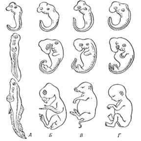 Последовательные стадии развития зародышей рыбы (Л), курицы (Б), свиньи (В), человека (Г)