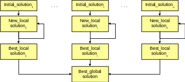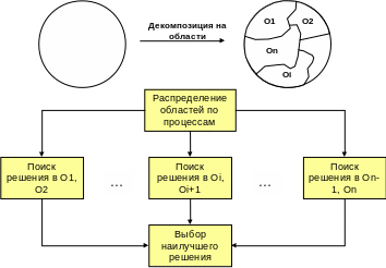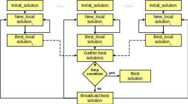 Процесс i посылает процессу i+1 своё текущее решение. Процесс i+1 принимает это решение в качестве текущего, если F(Xi) < F(Xi+1). Где F(Xi) – значение целевой функции текущего решения i-ого процесса.