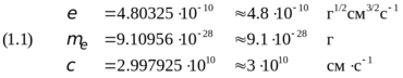 Итак, массу мы измеряем в граммах (г), размеры — в сантиметрах (см) и время — в секундах (с). В качестве базовых величин возьмем элементарный электрический заряд e, массу электрона me и скорость света c: