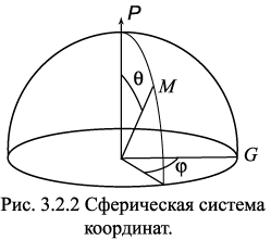 Введём сферическую систему координат (рис.3.2.2). Начало отсчёта помещаем в центр контрольной площадки, а направление на полюс P выберем вдоль вектора n. При таком выборе осей