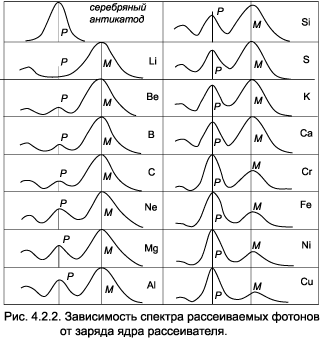 Комптоновское рассеяние, в отличие от рассмотренного выше фотоэффекта, явно показывает роль ядра и окружающих его электронов внутренних оболочек. Наряду со смещённой длиной волны λ (правый пик М), присутствует пик первичного излучения Р, интенсивность которого растёт с увеличением заряда ядра Z элемента рассеивателя. Появление несмещённого пика обусловлено рассеянием на электронах внутренних оболочек. Они жёстко связаны с ядром, так что импульс фотона передаётся всей массе атома. Учитывая, что смещение обратно пропорционально массе рассеивателя, приходим к выводу, что усиление несмещённой компоненты с ростом Z связано с увеличением доли внутренних оболочек.