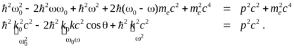 Уединим радикал в правой части первого уравнения, а во втором уравнении перенесём ħk в левую часть. После этого возводим в квадрат оба уравнения и второе умножаем на c2. Теперь в уравнения входит угол рассеяния и модуль импульса:
