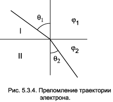 Теперь рассмотрим электрон с импульсом p, который проходит через границу сред с разностью потенциалов . Её можно создать, например, приложив напряжение к сеткам на поверхности раздела двух сред, как на рис.5.3.4. При пересечении границы раздела сохраняется неизменной тангенциальная составляющая импульса