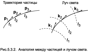 мысл такой замены иллюстрирует рис.5.3.2. Траекторию частицы мы задаём, определяя в различные моменты времени импульс p. Аналогично, ход луча мы ассоциируем с перемещением волнового вектора k, нормального к волновому фронту. Положение волнового фронта в разные моменты времени на рисунке обозначено штриховыми линиями. Напомним, что волновое число k связано с длиной волны: k=2π/. Длина волны, в свою очередь, обратно пропорциональна показателю преломления среды n: