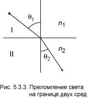 Проиллюстрируем связь между импульсом в механике и показателем преломления в оптике. При переходе границы двух прозрачных сред луч света изменяет своё направление. На рис. 5.3.3 n1 и n2 — значения показателя преломления в каждой среде. Углы 1 и 2 отсчитываются от нормали к