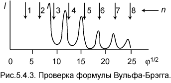 Уравнение (4.1), называемое формулой Вульфа-Брэгга, полностью соответствует известному условию максимумов в явлении интерференции при отражении света от тонких плёнок.