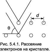 а рис.(5.4.1) схематически изображена электронная волна, падающая на кристалл под углом скольжения . Постоянную решётки обозначим d. Из чертежа ясно, что разность хода двух лучей, отражённых от соседних плоскостей, равна