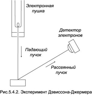 первые дифракцию электронов наблюдали в 1927 году К. Дэвиссон и Л. Джермер (Нобелевская премия по физике) и годом позднее Тартаковский и Томсон. Ещё раньше, в 1923–25 г.г., в заводской лаборатории Bells Дэвиссон и Кэнсман исследовали рассеяние пучка электронов металлической поверхностью. Схема эксперимента изображена на рис.5.4.2. Полярная диаграмма рассеяния представляла собой более или менее плавную кривую без чётко выраженных особенностей. Открытию предшествовал «несчастный случай» — разгерметизация установки. После отжига окислившегося кристалла (никель) на кривой рассеяния обозначилась лепестковая структура, которую авторам эксперимента удалось объяснить с привлечением формулы Вульфа–Брэгга (4.1) и соотношения де Бройля