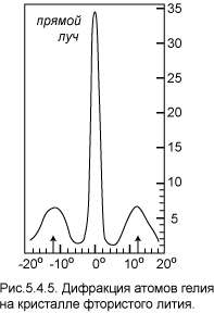 рассеяния . Центральный максимум соответствует пучку, не испытавшему отклонения, боковые — первым интерференционным максимумам. Аналогичная картина наблюдалась для пучков молекул водорода (рис.5.4.6).