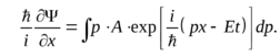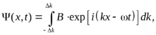 где B — амплитуда. Будем считать, что величина B как функция k равна нулю при k < –Δk и k > Δk. Тогда областью интегрирования становится вся числовая ось. Вспоминая соотношения де Бройля-Эйнштейна (формулы (2.1) и (2.1а) первой главы), приходим к новой записи выражения для волнового пакета