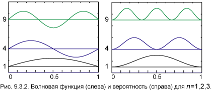 На рис.9.3.2 изображены волновая функция (x) (слева) и вероятность W(x) (справа) для трёх первых значений n = 1, 2, 3. По горизонтальной оси отложено отношение x/L.Чёрным цветом обозначено основное состояние, синим — n = 2 и зелёным — n = 3. Прямые линии параллельные оси x (1, 4 и 9) отмечают значение энергии. В тех точках, где волновая функция обращается в нуль, частица никогда не будет обнаружена. Это противоречит представлениям классической механики. Нулям функции W(x) соответствуют узлы стоячих волн в теории колебаний.