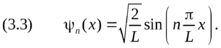 Подсчитаем число узлов волновой функции. Функция, описывающая основное состояние частицы, обращается в нуль только на концах интервала, а внутри него она узлов не имеет. В первом возбуждённом состоянии волновая функция имеет ровно один корень внутри отрезка (0, L), во втором — два и так далее. Здесь проявляются общие закономерности одномерного движения. В математике известна так называемая осцилляционная теорема, справедливая для дискретного спектра энергии. Она связывает друг с другом номер волновой функции и число узлов. Перенумеруем собственные значения оператора с помощью числа n, принимающего следующий ряд значений: