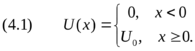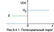 барьера. В квантовой механике ситуация сложнее. Рассмотрим потенциал, изображённый на рис.9.4.1. График потенциальной энергии изображён синей линией. Она обращается в нуль в области отрицательных значений аргумента и равна постоянной величине U0 для