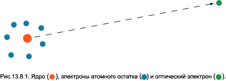 остаток: ядро и электроны в основном состоянии. Пунктирная стрелка указывает на валентный электрон. Расстояния между всеми электронами внутри атомного остатка гораздо меньше, чем расстояние от любого из них до оптического электрона. Поэтому их суммарный заряд можно считать практически полностью сосредоточенным в центре. Следовательно, можно полагать, что оптический электрон движется под действием кулоновской силы, направленной к ядру, и, таким образом, его уровни энергии вычисляются по формуле Бора (5.2). Электроны атомного остатка экранируют ядро, но не полностью. Для учёта частичной экранировки введено понятие эффективного заряда атомного остатка Zeff. В рассматриваемом случае сильно удалённого электрона величина Zeff равна разности атомного номера химического элемента Z и числа электронов атомного остатка. Здесь мы ограничимся случаем нейтральных атомов, для которых Zeff = 1.