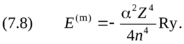 Выведенные формулы имеют два ограничения. Во–первых, в них не учитываются релятивистские эффекты, что даёт ошибку порядка (V/c)2. Релятивистская поправка растёт по мере увеличения заряда ядра как Z4 и для иона FeXXVI уже составляет доли процента. В конце данной главы мы рассмотрим этот эффект, оставаясь в рамках планетарной модели. Во–вторых, помимо квантового числа n энергия уровней определяется другими параметрами — орбитальным и внутренним моментами электрона. Поэтому уровни расщепляются на несколько подуровней. Величина расщепления также пропорциональна Z4 и становится заметной у тяжёлых ионов.