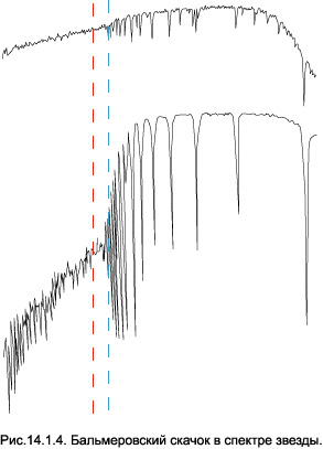 Бальмеровским скачком называется депрессия излучения в спектрах звёзд на длинах волн короче 3700Å. На рис.14.1.4 изображены регистрограммы спектров двух звёзд. Красная граница