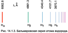 рис.14.1.3. Положение линии отмечено цветной линией; сверху — длина волны в ангстремах, снизу — принятое обозначение перехода. Головная линия H находится в красном диапазоне спектра; обычно она оказывается самой сильной линией серии. Остальные переходы монотонно ослабевают по мере увеличения главного квантового числа верхнего номера. Линия H расположена в сине–зелёном участке спектра, а остальные — в синей и фиолетовой областях.
