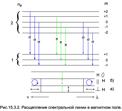Такие переходы называются «разрешёнными». Интенсивность компонент с другими комбинациями магнитных чисел значительно ниже — на несколько порядков величины. На рис.(15.3.2) приведён случай, когда азимутальное квантовое число нижнего уровня равно двум, а верхнего — трём. При наблюдении в направлении, перпендикулярном к магнитному полю