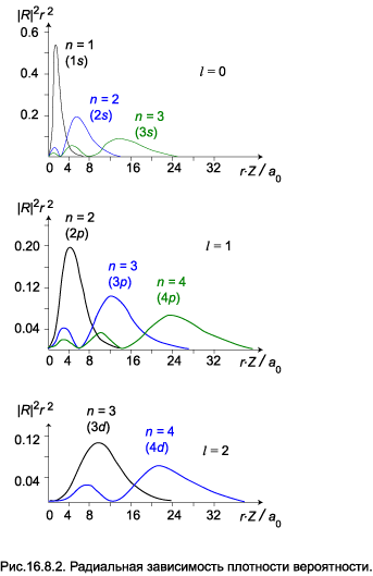 то есть, боровский радиус n–й орбиты. На рис.16.8.2 приведены профили вероятности W(r) для отдельных квантовых состояний.