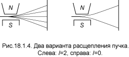 На рис. 18.1.4 приведены два случая. Слева — расщепление, объясняемое в модели орбитального момента при l=2: видно пять компонент с несмещённым пучком в центре. Справа — расщепление на два пучка, причём тому же самому значению магнитного поля отвечает вдвое бóльшее расстояние между ними, чем на левом рисунке.