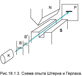 Важную роль в развитии атомной физики сыграли опыты Штерна и Герлаха по исследованию отклонения атомных пучков в неоднородном магнитном поле. Схема опыта приведена на рис.18.1.3. В сосуде, где создан глубокий вакуум, печка K испускает атомы некоторого химического элемента. С помощью диафрагм B и B' создаётся резко ограниченный