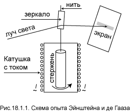 Наличие связи между механическим и магнитным моментами неоднократно проверялось в разных экспериментах. На рис.18.1.1 схематически изображён опыт Эйнштейна и де Гааза.