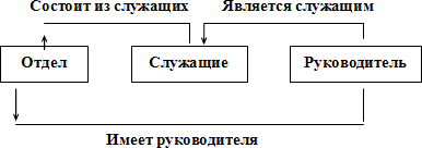 На рис. 2.3 показан простой пример схемы сетевой БД. На этом рисунке показаны три типа записи: Отдел, Служащие и Руководитель и три типа связи: Состоит из служащих, Имеет руководителя и Является служащим. В типе связи Состоит из служащих типом записи-предком является Отдел, а типом записи-потомком – Служащие (экземпляр этого типа связи связывает экземпляр типа записи Отдел со многими экземплярами типа записи Служащие, соответствующими всем служащим данного отдела). В типе связи Имеет руководителя типом записи-предком является Отдел, а типом записи-потомком – Руководитель (экземпляр этого типа связи связывает экземпляр типа записи Отдел с одним экземпляром типа записи Руководитель, соответствующим руководителю данного отдела). Наконец, в типе связи Является служащим типом записи-предком является Руководитель, а типом записи-потомком – Служащие (экземпляр этого типа связи связывает экземпляр типа записи Руководитель с одним экземпляром типа записи Служащие, соответствующим тому служащему, которым является данный руководитель).
