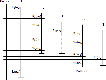 Транзакция T4 пытается создать версию ω4 объекта ω после того, как еще не зафиксированная транзакция T5 (начавшаяся позже) уже прочитала более раннюю версию ω4. Поэтому транзакция T5 не сможет «увидеть» изменения объекта ω, произведенные транзакцией T4. Следовательно, сериализация транзакций в порядке получения ими временных меток становится невозможной, и приходится произвести откат транзакции T4.
