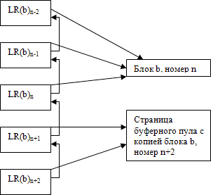 Для иллюстрации на рис. 14.3 показано пять записей об изменении блока b с номерами n-2, n-1, n, n+1, n+2. В блоке b содержится номер n. Это означает, что в состоянии блока отражены результаты операций изменения блока, соответствующих журнальным записям LR(b)n, LR(b)n-1 и LR(b)n-2. Изменения блока, произведенные операциями, которым соответствуют две хронологически последние журнальные записи LR(b)n+1 и LR(b)n+2, в его состоянии во внешней памяти не отражены, поскольку не было выполнено выталкивание во внешнюю память страницы буферного пула, содержащей копию блока b. Поэтому при восстановлении состояния блока требуется выполнить обратные операции изменения блока b, соответствующие журнальным записям LR(b)n, LR(b)n-1 и LR(b)n-2.