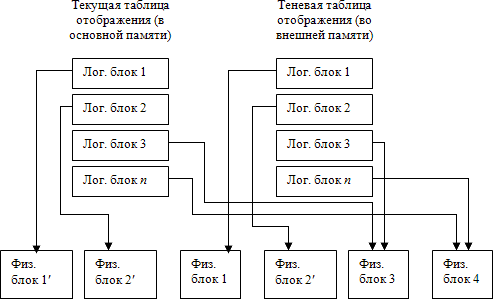 В контексте базы данных теневой механизм используется следующим образом [3.16]. Периодически выполняются операции установки точки физической согласованности базы данных. При выполнении этой операции все логические операции завершаются, все страницы буферного пула базы данных, содержимое которых отличается от содержимого соответствующих блоков внешней памяти, выталкиваются. Теневая таблица отображения файлов (сегментов) базы данных заменяется текущей таблицей отображения (правильнее сказать, текущая таблица отображения записывается на место теневой).