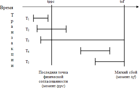 Наконец, для транзакции T5, начавшейся после момента tppc и не успевшей завершиться к моменту мягкого сбоя tfs, никаких действий предпринимать не требуется. Результаты операций этой транзакции полностью отсутствуют во внешней памяти базы данных.