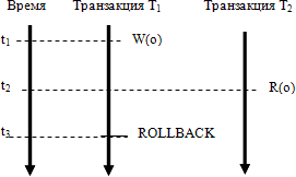 Рассмотрим сценарий совместного выполнения двух транзакций, показанный на рис. 13.1. В момент времени t1 транзакция T1 изменяет объект базы данных o (выполняет операцию W(o)). До завершения транзакции T1 в момент времени t2 > t1 транзакция T2 также изменяет объект o. В момент времени t3 > t2 транзакция T2 завершается оператором ROLLBACK (например, по причине нарушения ограничений целостности).