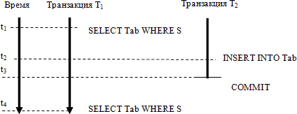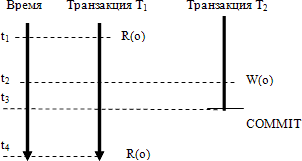Эта ситуация тоже не соответствует требованию изолированности пользователей (каждый пользователь начинает свою транзакцию при согласованном состоянии базы данных и имеет право видеть только согласованные данные). Чтобы избежать ситуации чтения "грязных" данных, до завершения транзакции T1, изменившей объект базы данных o, никакая другая транзакция не должна читать объект o (например, достаточно заблокировать доступ по чтению к объекту o до завершения изменившей его транзакции T1).