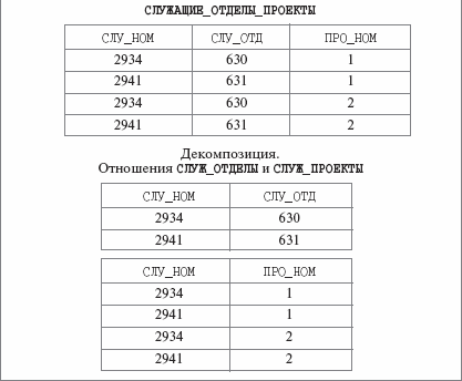 Для преодоления этих трудностей можно произвести декомпозицию переменной отношения СЛУЖАЩИЕ_ПРОЕКТЫ_ЗАДАНИЯ на две переменных отношений – СЛУЖ {СЛУ_НОМ, СЛУ_УРОВ, СЛУ_ЗАРП} и СЛУЖ_ПРО_ЗАДАН {СЛУ_НОМ, ПРО_НОМ, СЛУ_ЗАДАН}. На основании теоремы Хита эта декомпозиция является декомпозицией без потерь, поскольку в исходном отношении имелась FD {СЛУ_НОМ, ПРО_НОМ}->СЛУ_ЗАДАН.