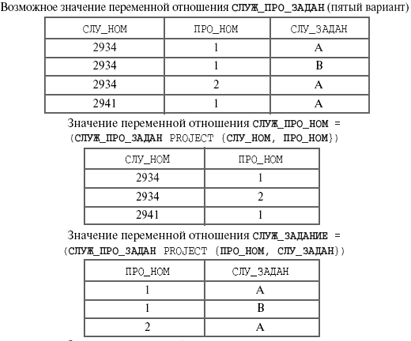 Рис. 9.3. Возможное значение переменной отношения СЛУЖ_ПРО_ЗАДАН (пятый вариант), результаты проекций и результат частичного естественного соединения