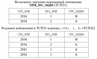 Добавление кортежа. Если некоторый уже участвующий в проектах служащий присоединяется к новому проекту, то к телу значения переменной отношения СЛУЖ_ПРО_НОМ требуется добавить один кортеж, соответствующий новому проекту.