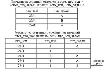 Как показано на рис. 9.3, результат естественного соединения проекций СЛУЖ_ПРО_НОМ и ПРО_НОМ_ЗАДАН почти совпадает с телом исходного отношения СЛУЖ_ПРО_ЗАДАН, но в нем присутствует один лишний кортеж, который исчезнет после выполнения заключительного естественного соединения с проекцией СЛУЖ_ЗАДАНИЕ. Читателям предлагается убедиться, что исходное отношение будет восстановлено при любом порядке естественного соединения трех проекций.