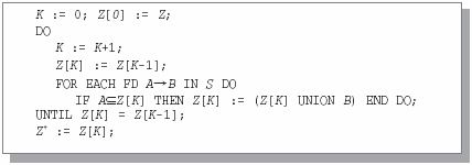 Замыкание множества атрибутов. Пусть заданы отношение r, множество Z атрибутов этого отношения и некоторое множество FD S, выполняемых для r. Тогда замыканием Z над S называется наибольшее множество Z+ таких атрибутов Y отношения r, что FD Z->Y входит в S+