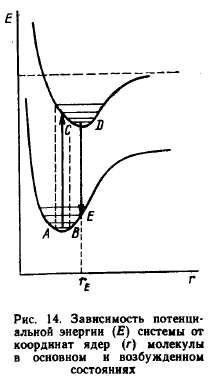Полная энергия состояния молекулы Е складывается из энергии электронного возбуждения Ее, колебательной энергии Еv и вращательной энергии Er. Таким образом, при поглощении кванта света молекулой полное изменение энергии можно представить в следующем виде: ашню = дельта Ее + дельта Еv + дельта Er . Энергия вращательных квантов меньше, чем колебательных, а их энергия, в свою очередь, меньше энергии электронных (Er 10 в10 Гц, Еv 10 в 13 Гц, Ее 10 в 18 Гц).