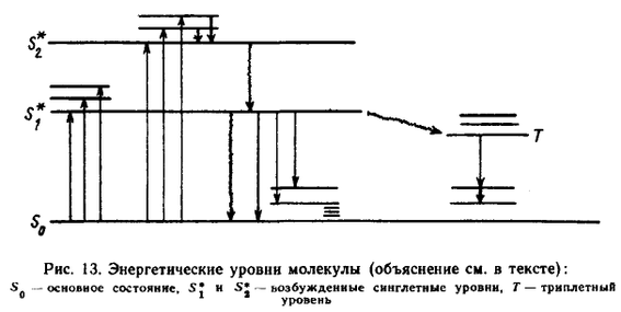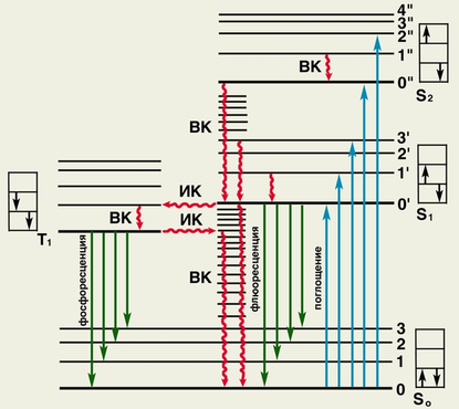 Возможные электронные переходы и энергетические состояния молекулы обычно представляются в виде схемы уровней энергии (Яблонского), где каждый электронный уровень расщепляется на ряд колебательных подуровней, а каждый колебательный — на ряд вращательных подуровней (рис. 1)
