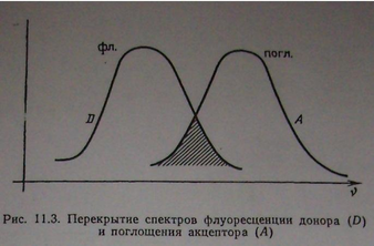 Вероятность индуктивно-резонансного перехода пропорциональна степени перекрытия спектра флуоресценции донора и спектра поглощения акцептора (рис. 2) и обратно пропорциональна R в 6ой степени, где R — расстояние между взаимодействующими молекулами. Расстояния, на которых эффективно происходит индуктивно-резонансный перенос энергии, составляют около 20—50 А со скоростями 10 в6-10в 11 с-1.