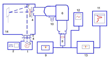 12. Осциллограф. 13. Усилитель. 14. Кюветная камера.