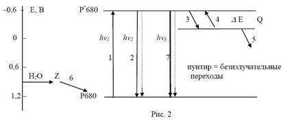 излучением квантов света ашню2), или переход 3 на уровень первичного акцептора Q c потерей энергии на величину дельтаE и Р680+. Далее происходит перенос электрона на вторичные акцепторы (переход 5) и восстановление фотоокисленногохлорофилла реакционного центра от первичного донора Z (6). Реакциями 5 и 6 завершается цикл окислительно-восстановительных реакций, связанных с утилизацией энергии поглощенного антенным хлорофиллом кванта света.