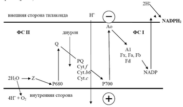 Световая стадия фотосинтеза зеленых растений осуществляется двумя пространственно разделенными фотосистемами, которые сопряжены цепью переносчиков электронов (рис. 2).