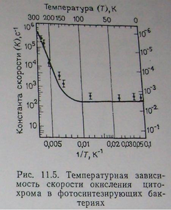 Эксперименты показали, что перенос электрона в фотосинтетической цепи идет эффективно как при комнатных, так и при низких температурах. На рис. приведена кривая зависимости окисления цитохрома фотоактивной молекулой бактериохлорофилла в фотосинтетических реакционных центрах. Как видно, кривая носит двухфазный характер. Начальный активационный участок кривой отражает влияние температуры на перестройки ядер атомов в белковых частях переносчиков, которые необходимы для обеспечения эффективного переноса электрона. При низких температурах эти перестройки затруднены, в результате чего скорость переноса электрона падает. Однако здесь перенос происходит хотя и медленнее, но зато и мало зависит от температуры. Именно этому соответствует безактивационный низкотемпературный участок кривой переноса электрона (рис. 5).