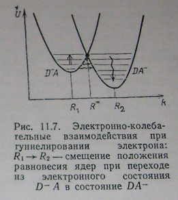 Это значит, что равновесные ядерные координаты R1 и R2 начального (Д-А) и конечного (ДА-) состоянии отличаются. Однако существует точка R* в которой кривые потенциальной энергии пересекаются. Очевидно, в точке R* энергии начального (Д-А) и конечного (ДА-) состояний совпадают. Допустим, что донорно-акцепторный комплекс, находившийся в состоянии Д-А, перестроился таким образом, что его ядерная координата попала в окрестность точки R*. Само по себе это необязательно приведет к переносу электрона. Но в точках, близких к R*, сравнительно невелика ширина барьера туннелирования, отделяющего потенциальные кривые начального и конечного состояний. Поскольку около точки R* энергии начального и конечного состояний близки, то во время пребывания системы около R* электрон может успеть протуннелировать от Д- на А. Для закрепления на акцепторе электрон должен успеть потерять часть своей энергии, чтобы не вернуться таким же образом назад. В свою очередь для этого ядерная система должна успеть перестроиться так, чтобы часть электронной энергии ушла в тепло, а вся система приобрела бы ядерную конфигурацию, соответствующую состоянию ДА- с координатой R2. В этом случае за время пребывания электрона на А ядерная конфигурация изменится так, что система «свалится» в точку В результате произойдет необратимый перенос электрона от Д к А и система перейдет в состояние ДА-.