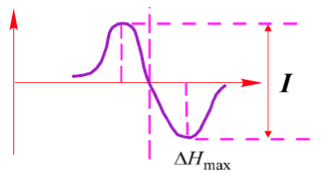 Для характеристики сигналов ЭПР употребляется набор параметров. Одним из таких параметров является амплитуда сигнала I (рис.3б), которая характеризует интенсивность сигнала. Величина I измеряется в подавляющем большинстве случаев в относительных единицах (например в мм). Ясно, что чем больше концентрация парамагнитных частиц в образце, тем больше будет величина (при неизменности ширины сигнала). Величиной, характеризующей ширину сигнала, служит ΔHmax - ширина линии между точками максимального наклона (рис.3б.). Эта величина измеряется в единицах магнитного поля - гауссах (Гс) или миллитеслах (мТл). Для того, чтобы измерить ΔHmax в единицах магнитного поля, необходимо знать масштаб по оси абсцисс на ленте самописца (т.е. знать сколько гаусс приходится, например, на 1 см на ленте самописца). Для измерения ΔHmax применяются специальные эталоны.