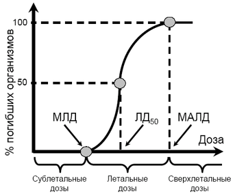 Характеристическая точка, значение ординаты которой составляет 50% гибели - значение дозы, соответствующее абсциссе этой точки называется полулетальной дозой (или средней летальной дозой) - обозначают как ЛД50 или ЛД50/30 (ЛД50/60), где в знаменателе подстрочного индекса указывают срок (в сутках), в течение которого наблюдают за гибелью. Вторая характеристическая точка имеет в качестве абсциссы минимальную абсолютно летальную дозу (МАЛД), т.е. минимальную дозу, вызывающую гибель всех облученных организмов (ордината – 100% гибели). Третья характеристическая точка имеет в качестве абсциссы т.н. минимальную летальную дозу (МЛД), т.е. практически ту максимальную дозу, которая не вызывает гибели ни одного из облученных организмов (ордината – 0% гибели). Строго говоря, термины «минимальная абсолютно летальная доза» и «минимальная летальная доза» не совсем правомерны, т.к. кривая гибели приближается к отметкам 100% и 0% ассимптотически. Поэтому обычно за минимальную абсолютно летальную дозу принимают дозу, вызывающую гибель 99% объектов (ЛД99), а за минимальную летальную дозу – дозу, вызывающую гибель 1% объектов (ЛД1). Дозы облучения, лежащие в диапазоне от минимальной летальной дозы до минимальной абсолютно летальной дозы, называют летальными дозами. Дозы, превышающие минимальную абсолютно летальную дозу, определяют как сверхлетальные. Дозы, лежащие ниже минимальной летальной дозы – как сублетальные.