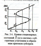 Проверим устойчивость точек. Зададим смещение от точки S3’ влево. Мы видим, что скорость притока субстрата стала больше скорости его оттока (тонкая линия над толстой кривой). При смещении вправо наоборот υp(S) > υприт (S)=> система стремиться вернуться в эту точку. Аналогично находим, что S3’’ неустойчива, а S3’’’ – устойчива. Устойчивые точки расположены на кривой υp(S) на участках AB и CD, а неустойчивые – на участке BC